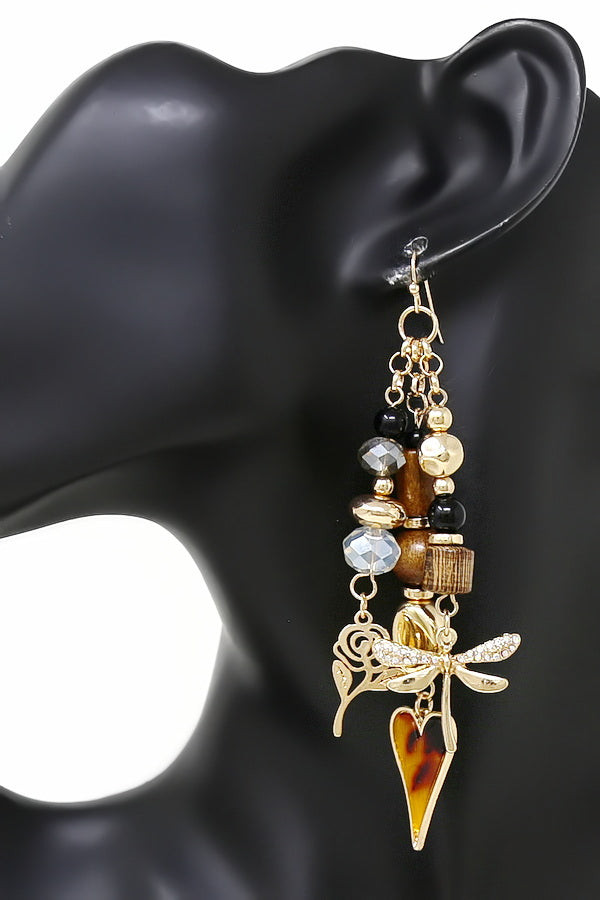 Rose Heart Dragonfly Beaded Fringe Dangle Earrings