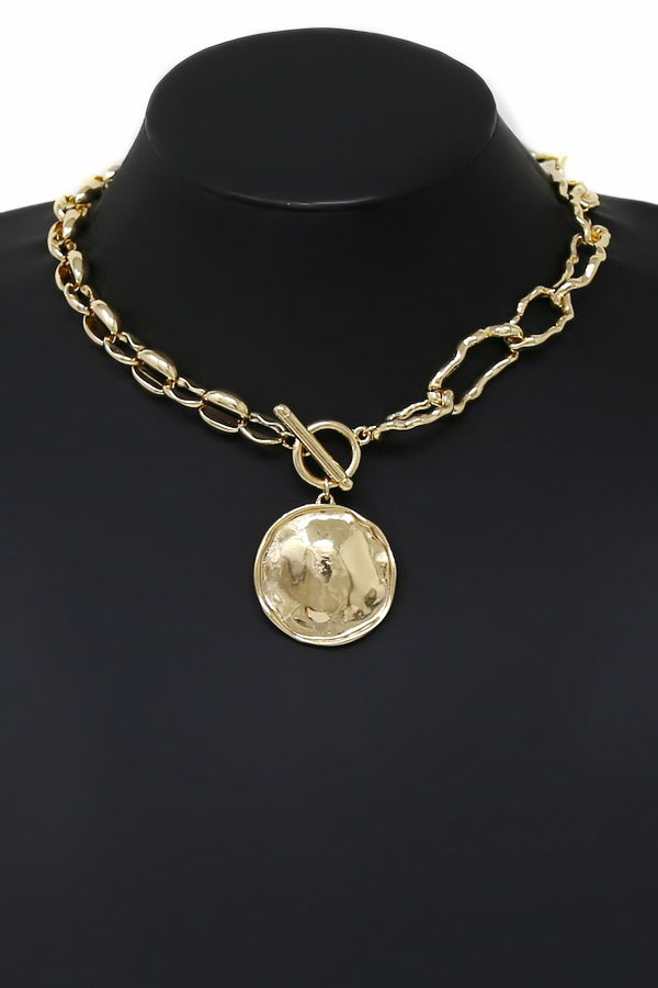 Hammered Circle Pendant Textured Chain Toggle Necklace