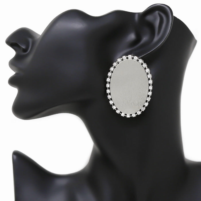 Glass Stone Trimmed Oval Shape Metal Earrings