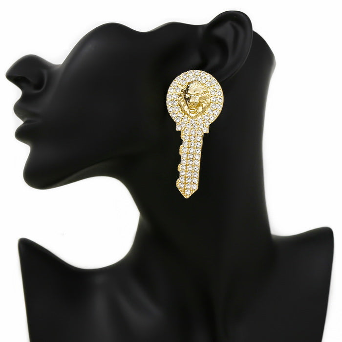 Lion Head Greek Pattern Glass Stone Pave Earrings