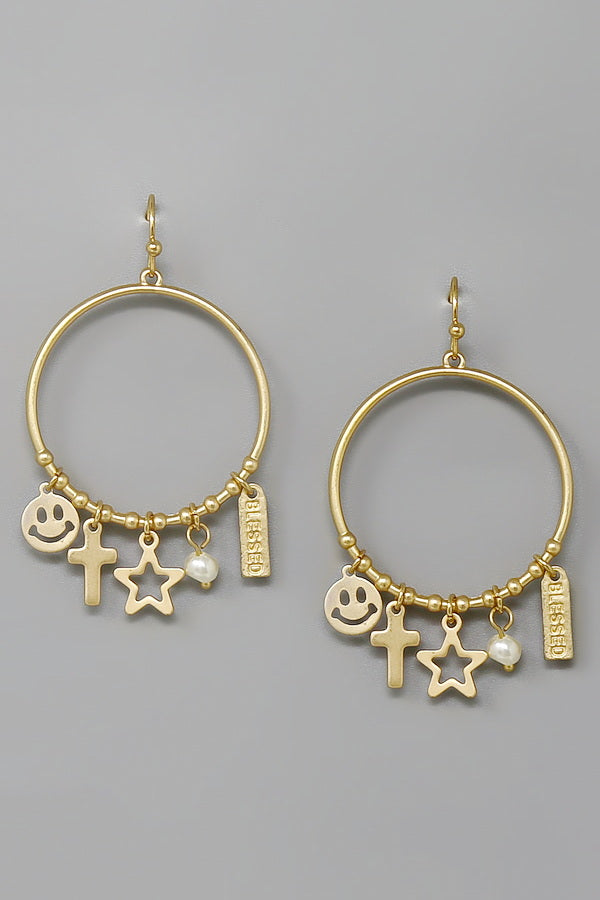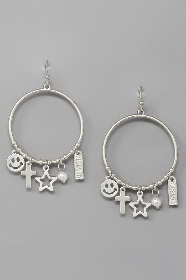 Cross Multi Charm Hoop Drop Earrings