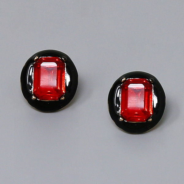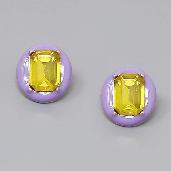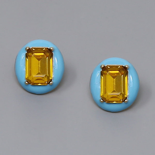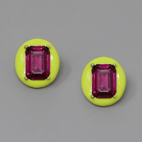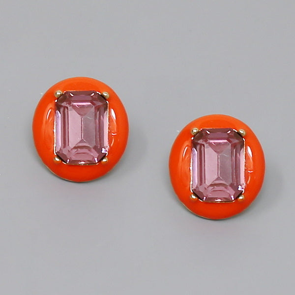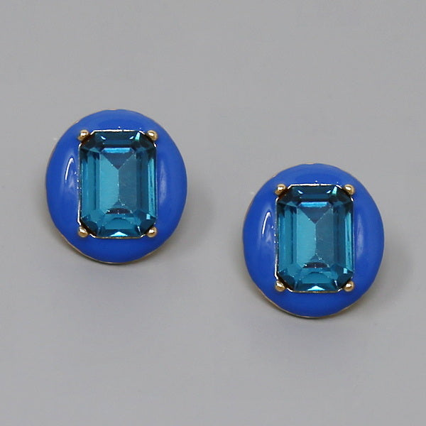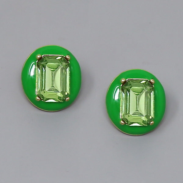 Emerald Cut Glass Stone Oval Enamel Stud Earrings