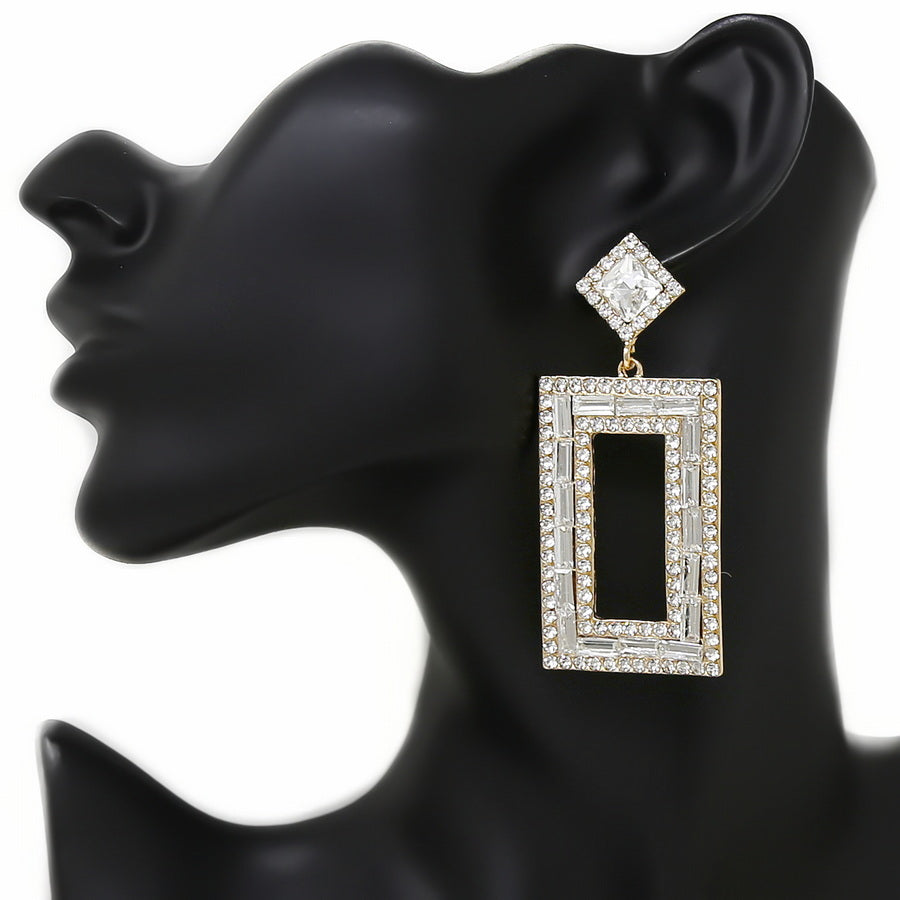 Glass Stone Embellished Rectangle Hoop Statement Earrings
