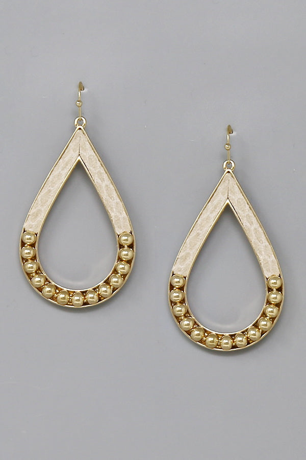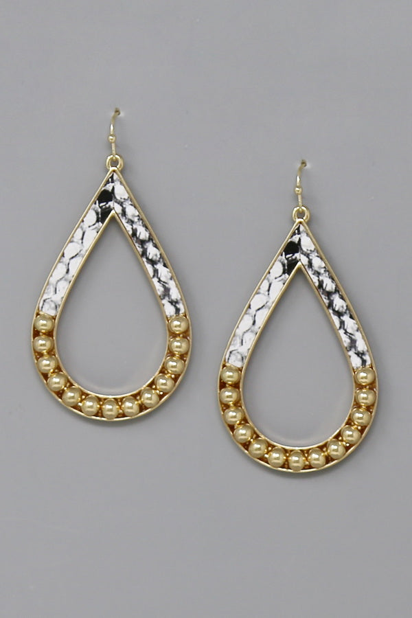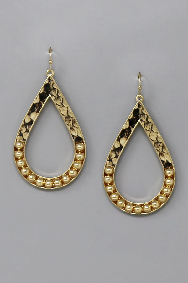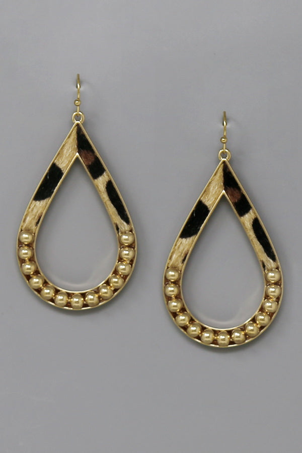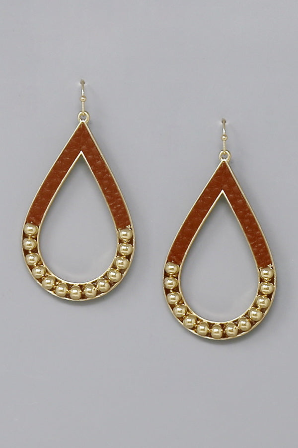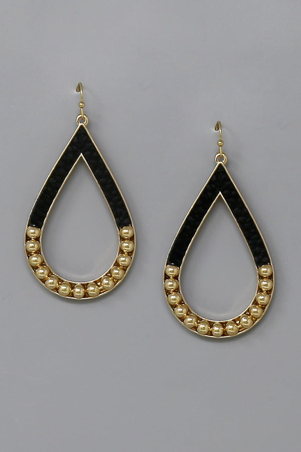 Metal Bead Detail Leather Teardrop Hoop Dangle Earrings