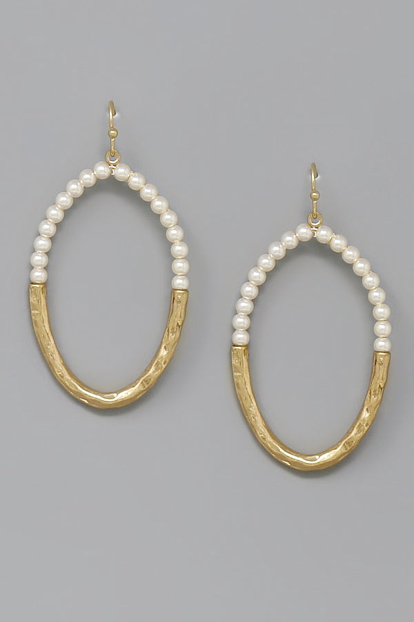 Pearl Beaded Hammered Metal Oval Hoop Drop Earrings