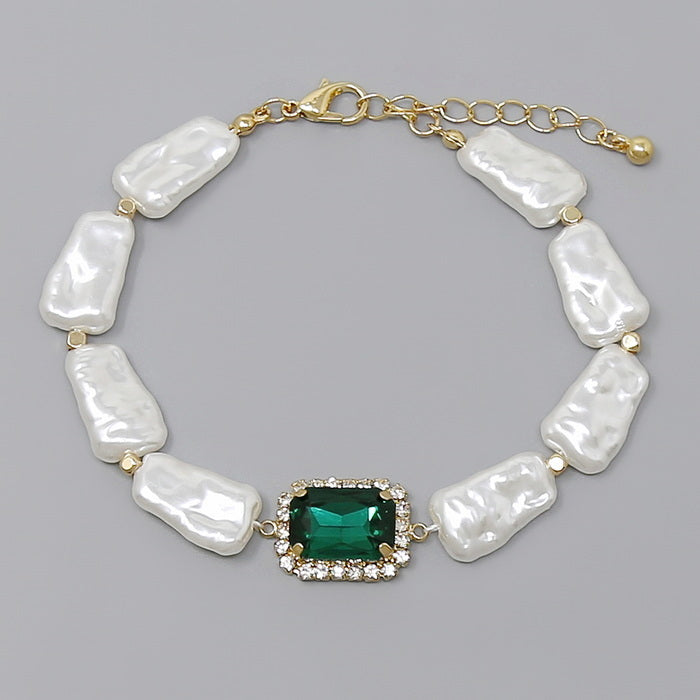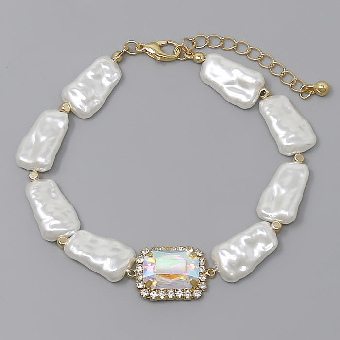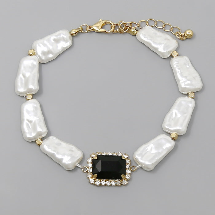 Rectangular Glass Stone Charm Pearl Beaded Bracelet