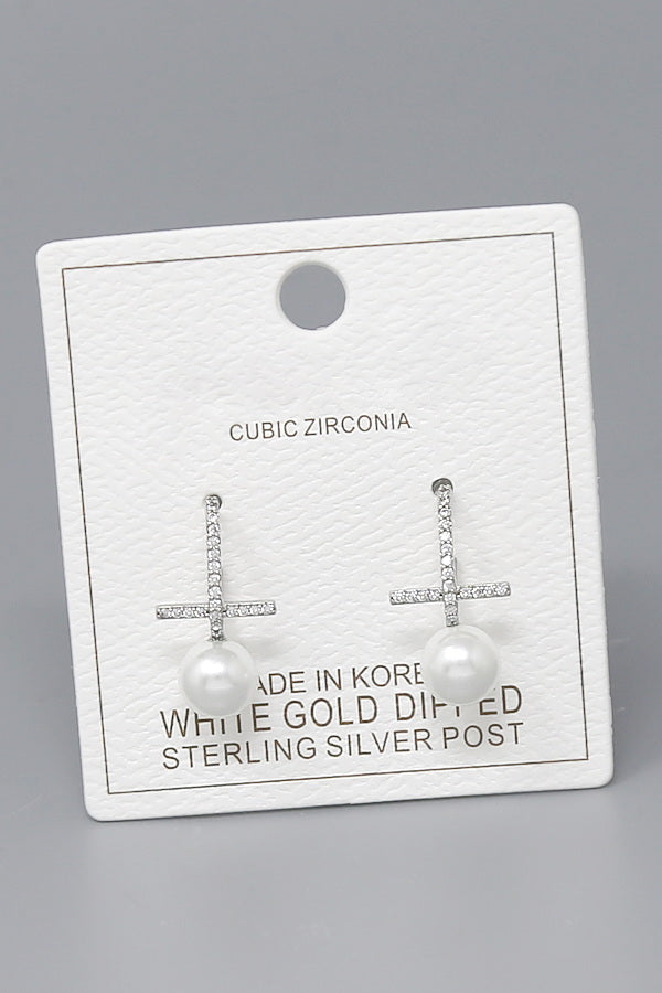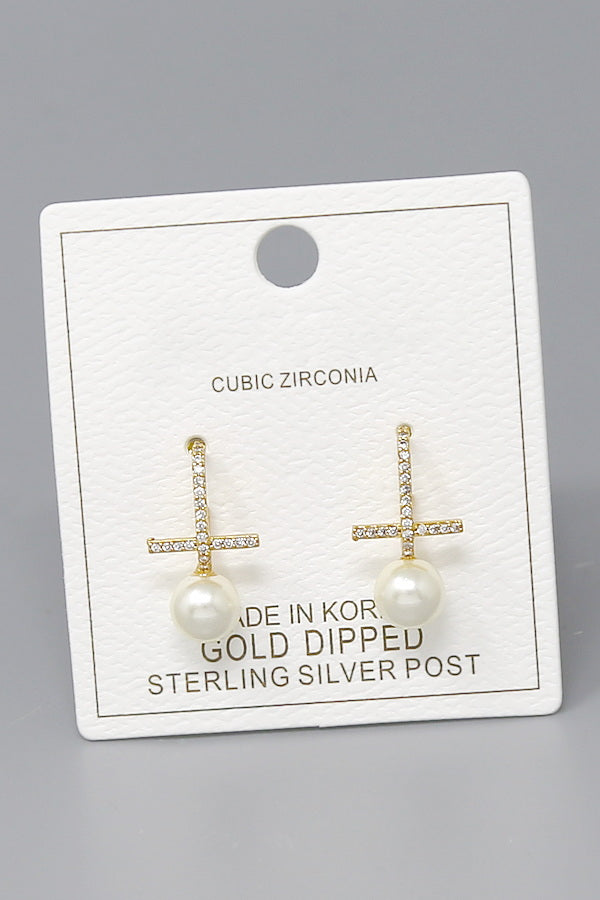 Cross Pearl Drop CZ Pave Gold Dipped Hoop Earrings