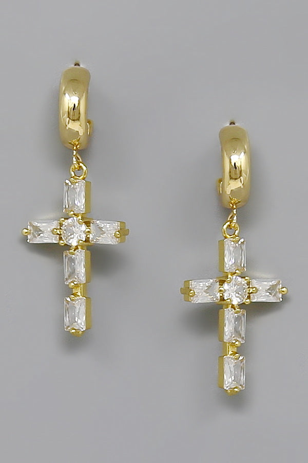 CZ Pave Cross Charm Gold Dipped Hoop Earrings