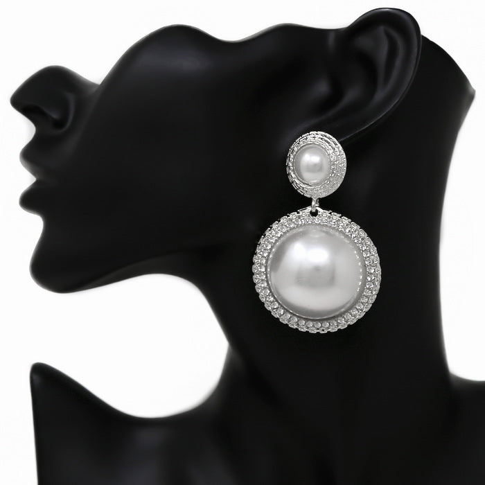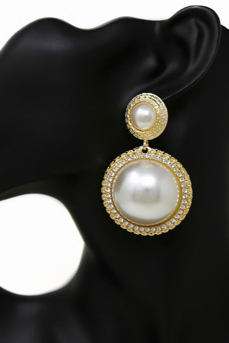 Glass Stone Trimmed Pearl Button Statement Earrings