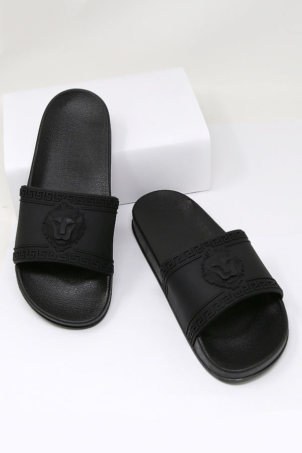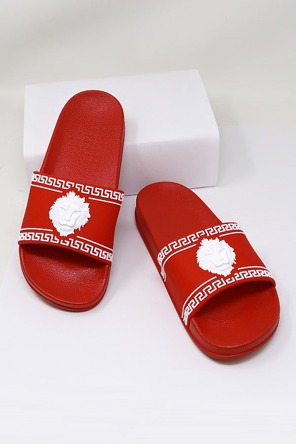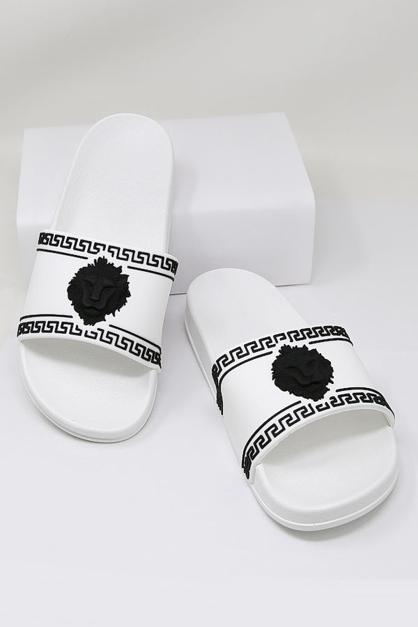 These Lion Accent Greek Pattern Trim Slides are perfect for the summer season. The unique lion head accents make each pair unique and stylish. For those looking to make a statement, these slides are the perfect summer accessory.