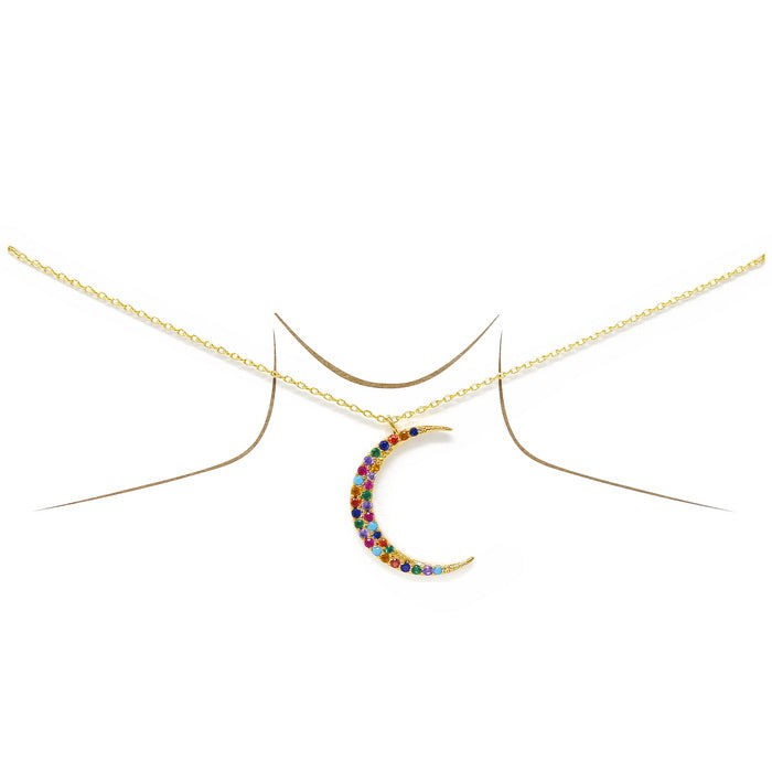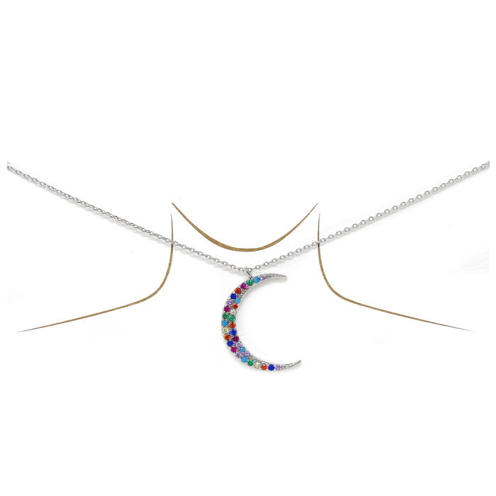 Multi Color CZ Stone Pave Crescent Pendant Short Necklace