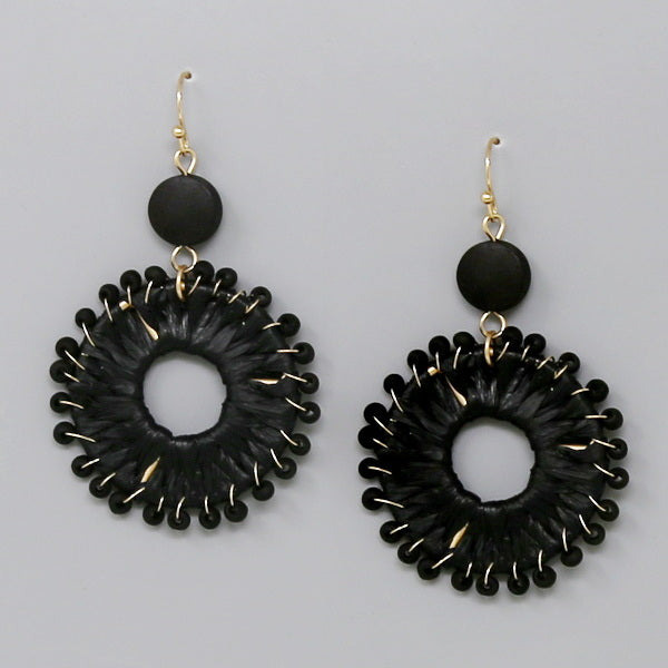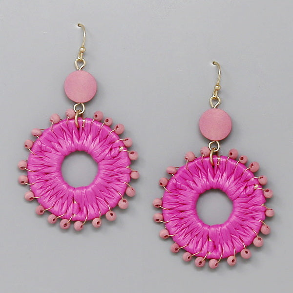 Raffia & Wood Bead Wrapped Hoop Dangle Earrings
