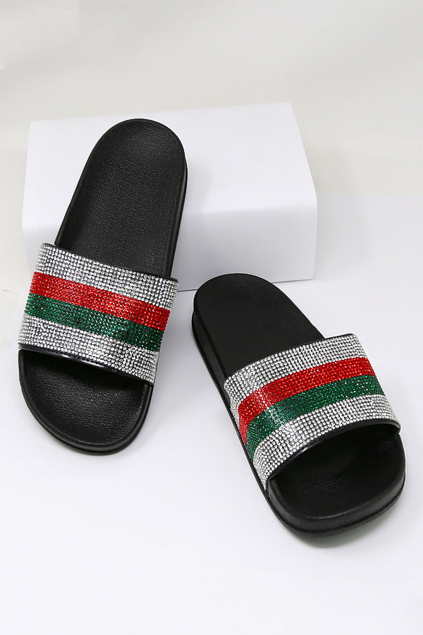 These Striped Rhinestone Embelished Slides feature rhinestone embellishments for an eye-catching and stylish look. With a soft cushioned insole, these sandals provide all-day comfort and support. The slip-on design makes them easy to put on and take off.