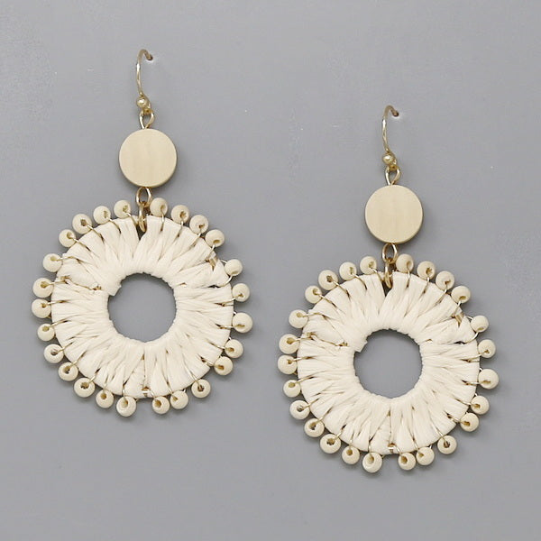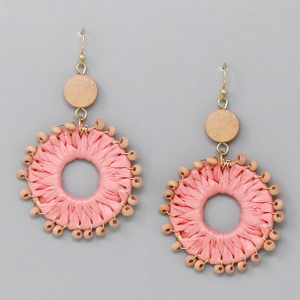 Raffia Wrapped Wooden Hoop Drop Earrings