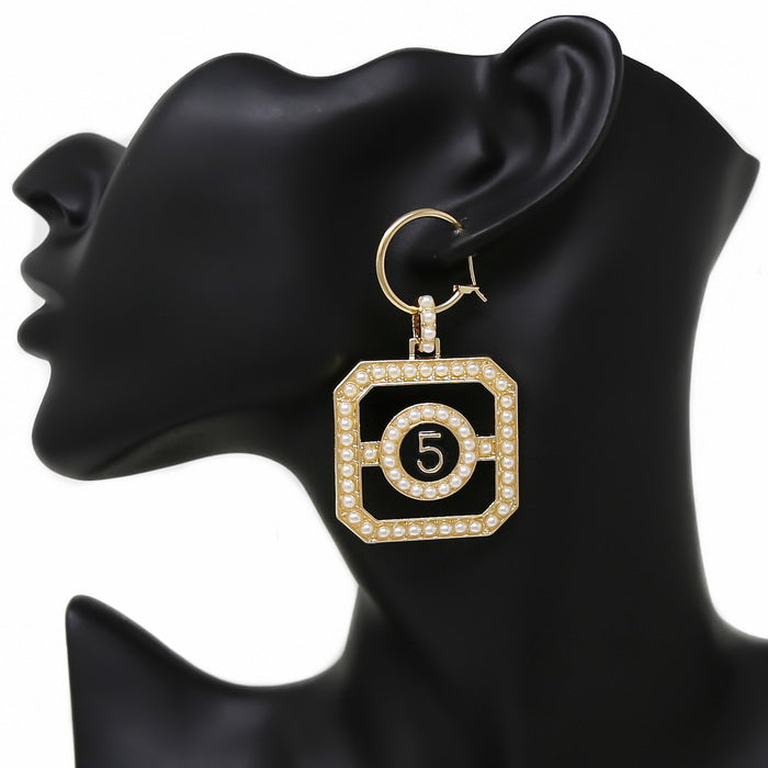 Number 5 Pearl / Rhinestone Pave Charm Hoop Earrings