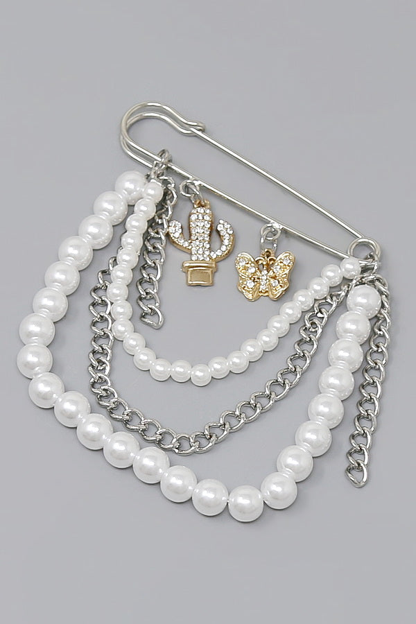 Cactus And Butterfly Multi Charm Pearl Drape Safety Pin Brooch