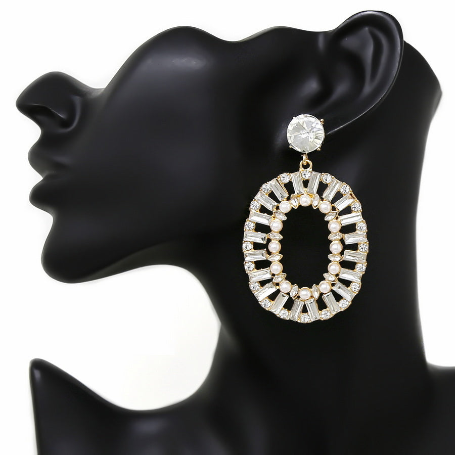 Baguette Glass Stone & Pearl Embellished Statement Earrings
