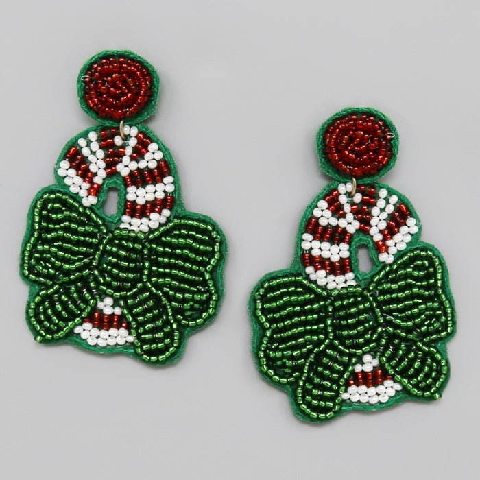 Christmas Candy Cane With Bow Seed Beaded Drop Earrings