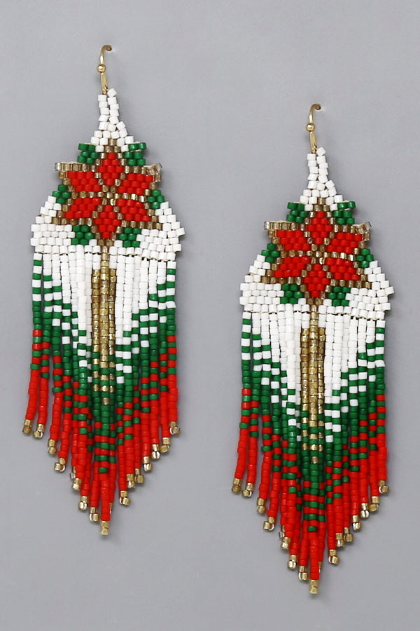 Christmas Poinsettia Seed Beaded Fringe Earrings