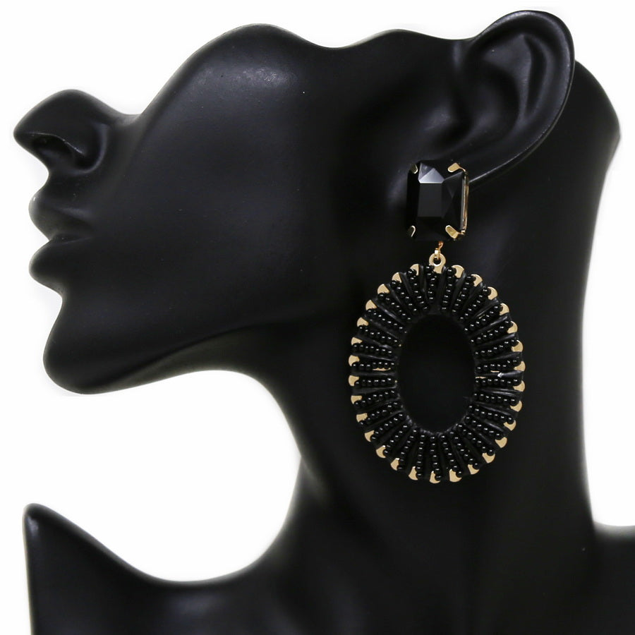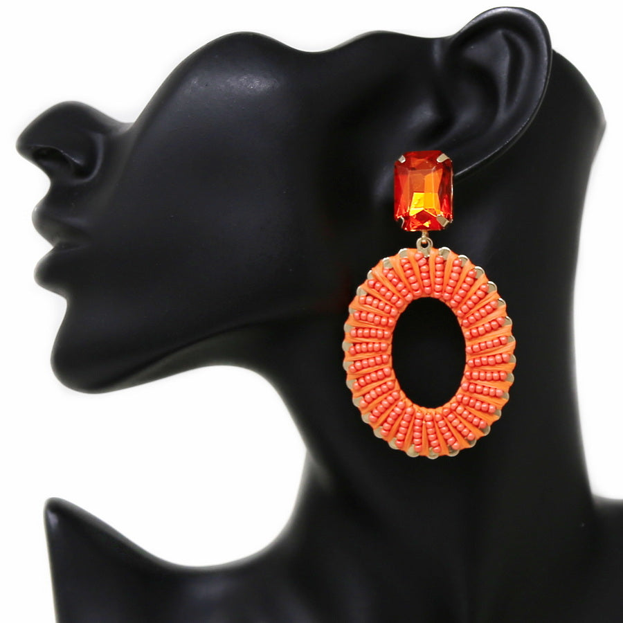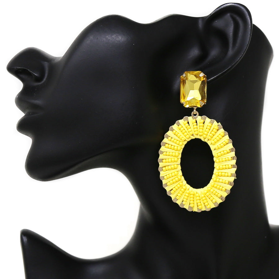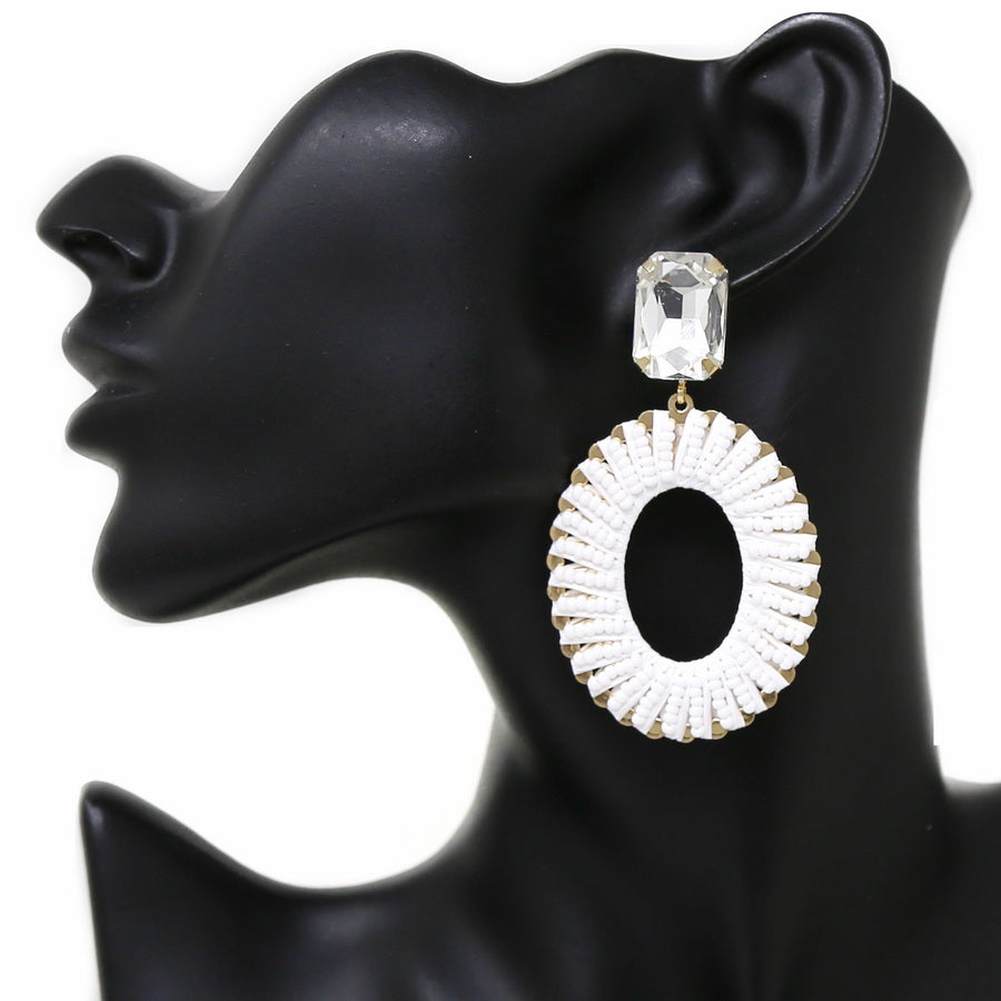 Seed Bead And Raffia Wrapped Oval Hoop Dangle Earrings