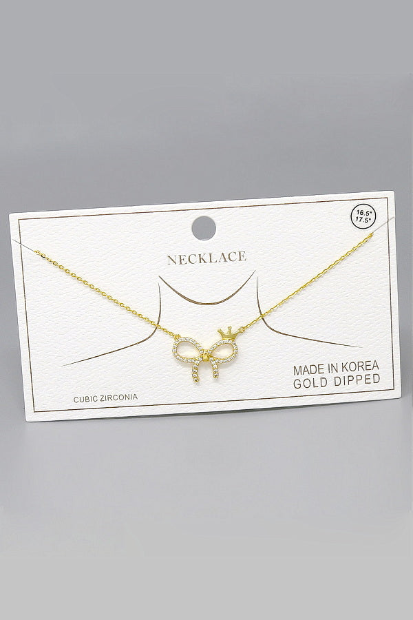 Bow With Crown CZ Pave Pendant Short Chain Necklace