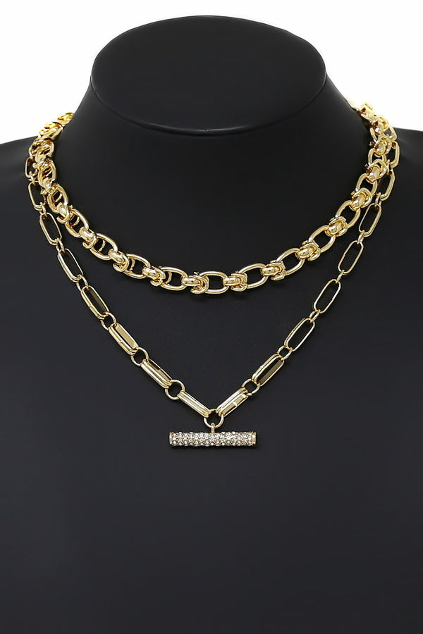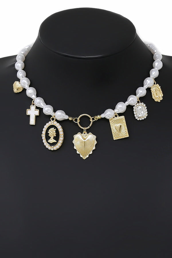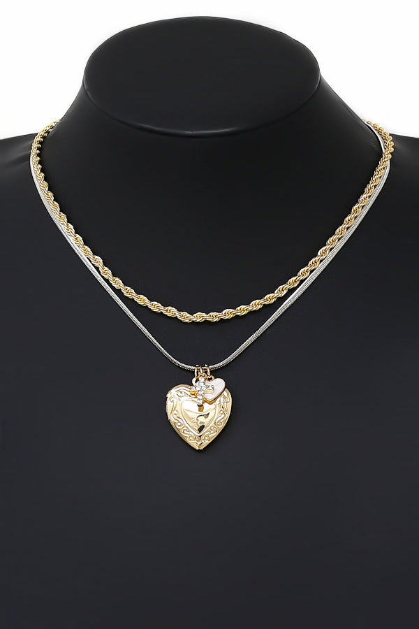 Heart and Cross Multi Charm Pendant Double Chain Necklace