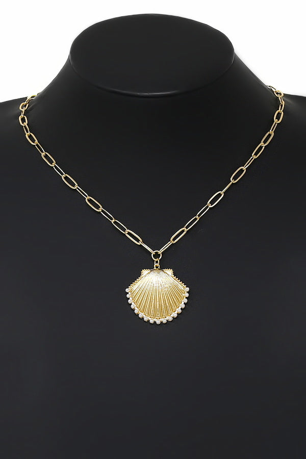 Pearl-Edged Scallop Shell Pendant Paperclip Chain Necklace