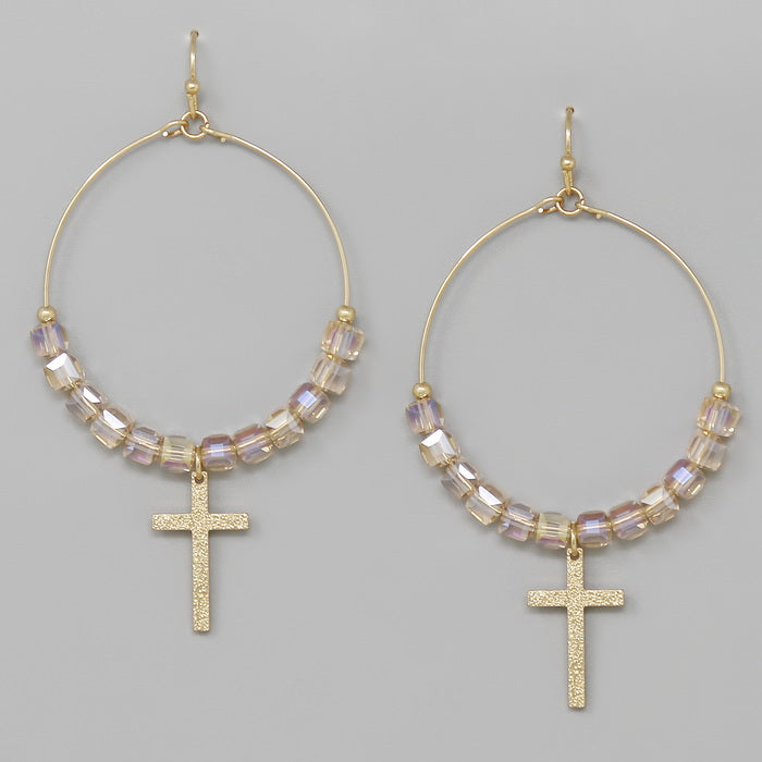 Cross Charm Glass Cube Beaded Hoop Earrings